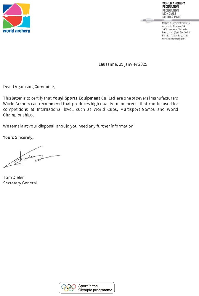 目前,主要生產和銷售射箭比賽及訓練專用器材,包括:箭靶、靶紙、靶架、號碼牌、風向旗、計時記分器等場地器材設備;反曲弓、復合弓、傳統(tǒng)弓、瞄準器、防震桿等弓箭裝備;箭壺、護胸、護臂、護指等各類箱包護具。公司所生產的射箭器材已通過國際射箭聯(lián)合會及中國射箭協(xié)會CAA認證。